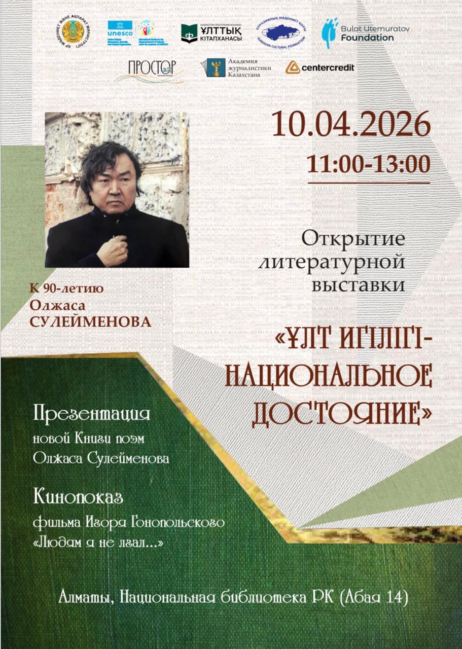 10 апреля 2026 г.ЮНЕСКО қамқорлығындағы Халықаралық мәдениеттерді жақындастыру орталығы, Қазақстан Республикасының Ұлттық кітапханасы, Еуразиялық мәдениет қоры және «Простор» әдеби-көркем журналы бірлесіп, Сізді ақын Олжас Сүлейменовтің 90 жылдық мерейтойына арналған «Ұлт Игілігі – Национальное Достояние» әдеби және ғылыми шығармалар көрмесінің ашылу салтанатына қатысуға шақырады.