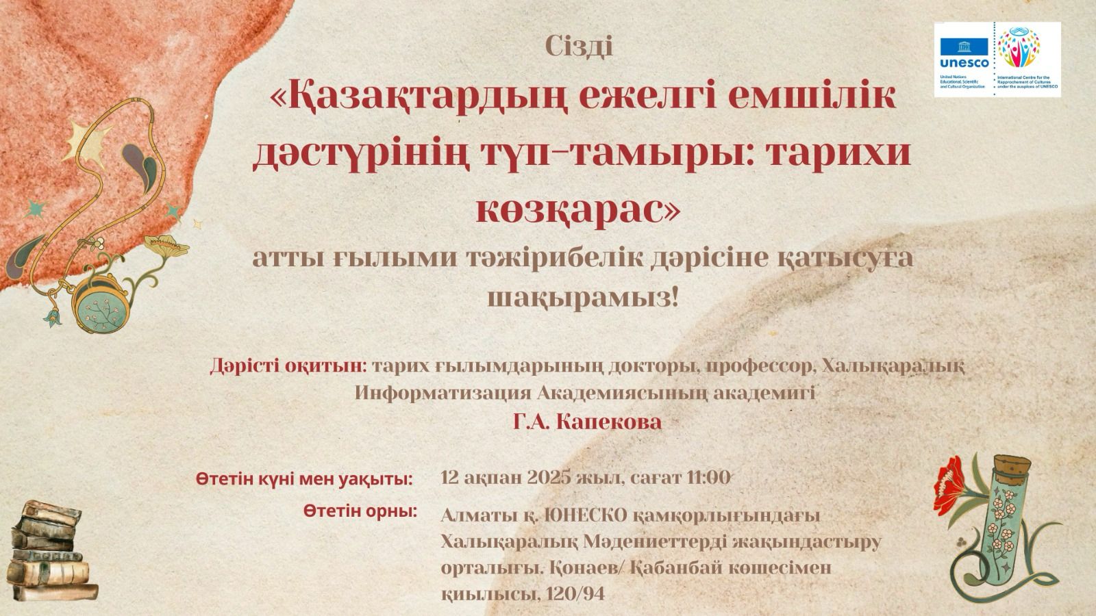 Алматыдағы ЮНЕСКО қамқорлығындағы Халықаралық мәдениеттерді жақындастыру орталығы Сіздерді «Ежелгі қазақ медицинасының шығу тегі: тарихи көзқарас» атты ғылыми-практикалық дәріске қатысуға шақырады.