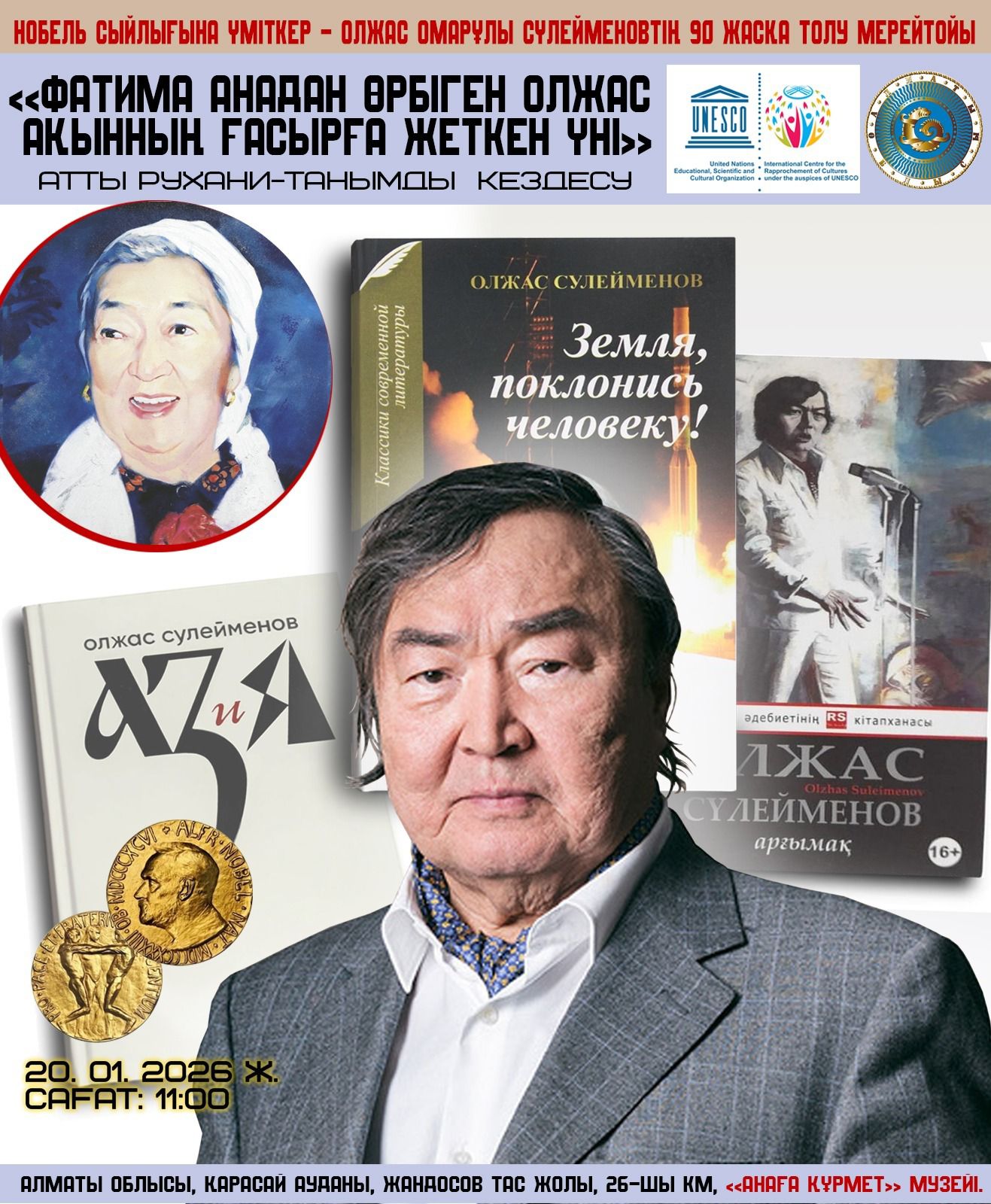 4 февраля 2026 г.2026 жылдың 4 ақпанында Алматыдағы ЮНЕСКО қамқорлығындағы Халықаралық мәдениеттерді жақындастыру орталығы Халықаралық инженерлік және технологиялық университетпен бірлесіп, «Олжас Сүлейменов Әлемінің ұйқастары» атты III әдеби фестивалін ұйымдастырады.